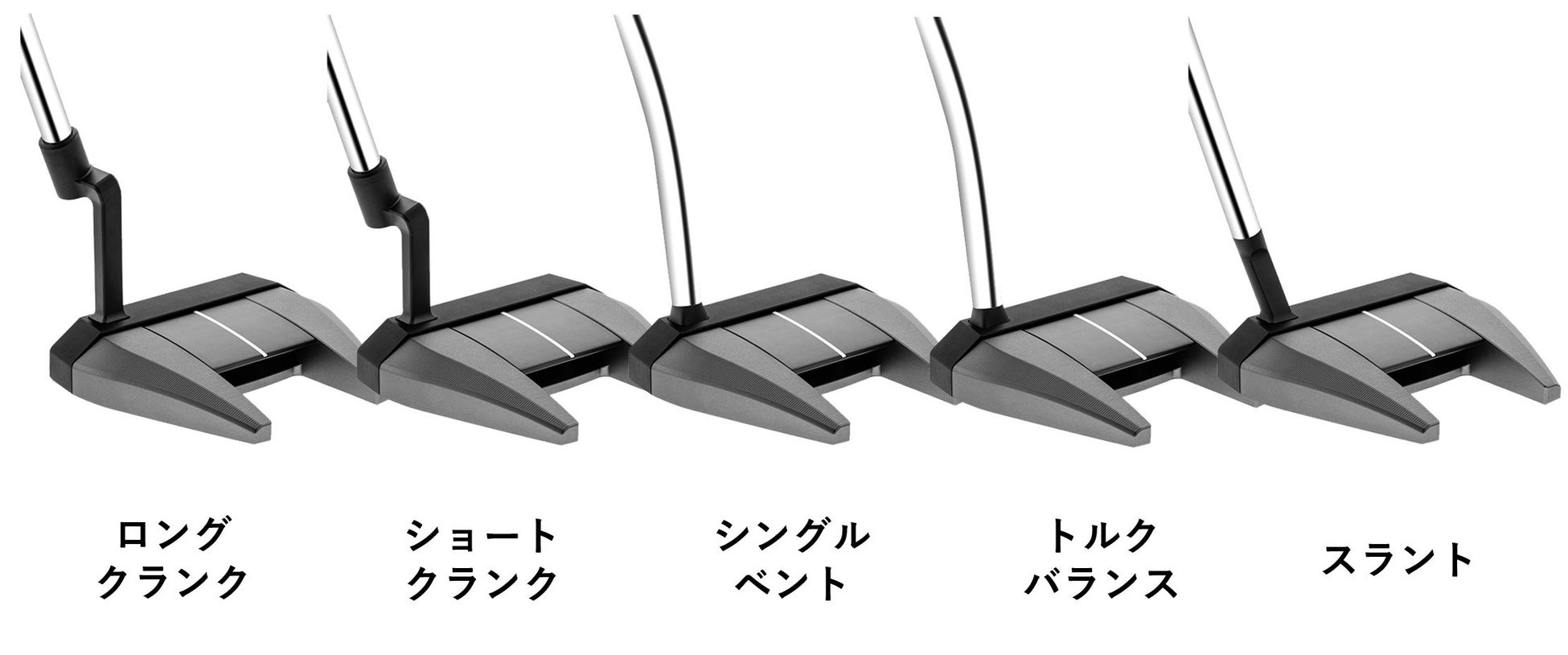 この3つの異なるストロークタイプに対応するためにEdel Golfは重心角に注目し、新たに5種類のホーゼル(ロングクランク、ショートクランク、シングルベント、トルクバランス、スラント)と4種類(マレット型3タイプとブレード型1タイプ)のヘッド形状を開発しました。