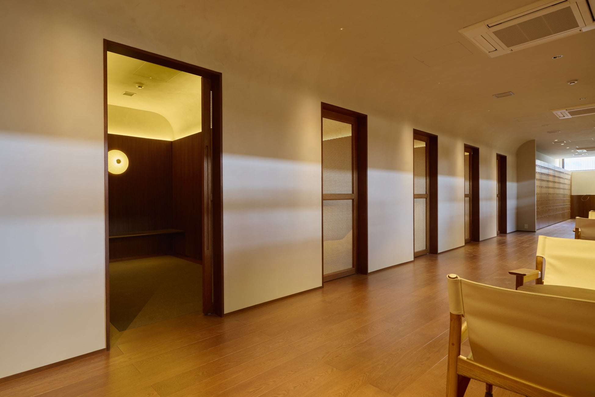温浴SPAに続くラウンジは、湯上がりの身体を静かに整えるための空間。淡いグレーベージュの壁とチーク色の木が穏やかな対比を描き、Rを帯びた天井と壁が包み込む。裸足で歩く床や個室の絨毯、低くあたたかな灯りが余韻をやさしく深め、静かに自分へ戻る時間へと導きます。