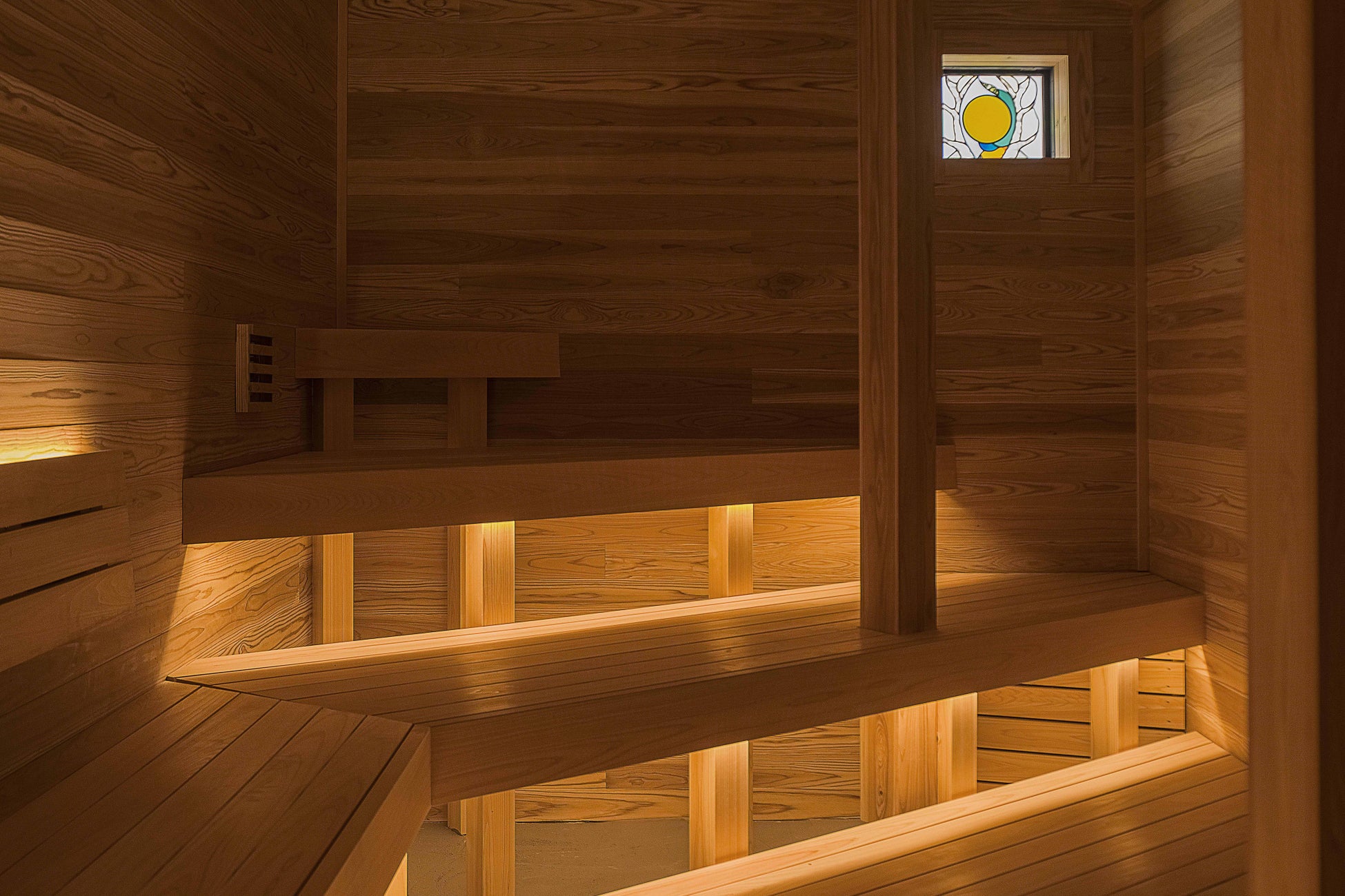 自然素材とモダンな感性を融合し、露天風呂や屋内外のサウナ、ゆったりと過ごせる休息ラウンジを備えています。旅の途中の立ち寄りにも、滞在の締めくくりにもふさわしい、心と身体をときほぐすための空間です。デザインの軸にあるのは「静かな上質さと、旅をほどく森の玄関口」という考え方。装飾を削ぎ落とし、素材そのものの質感とプロポーションによって全体を構成しています。壁には天然木材を用い、床やシャワーブースにはやわらかなベージュトーンの天然石やタイルを採用。天井には自然光と間接光を忍ばせ、光が穏やかに広がる設計としました。水盤や浴槽は直線的に整え、木・石・水・光のみで成立するミニマルな構図を形成。時間とともに移ろう光と陰影が、静かな深呼吸へと導きます。
