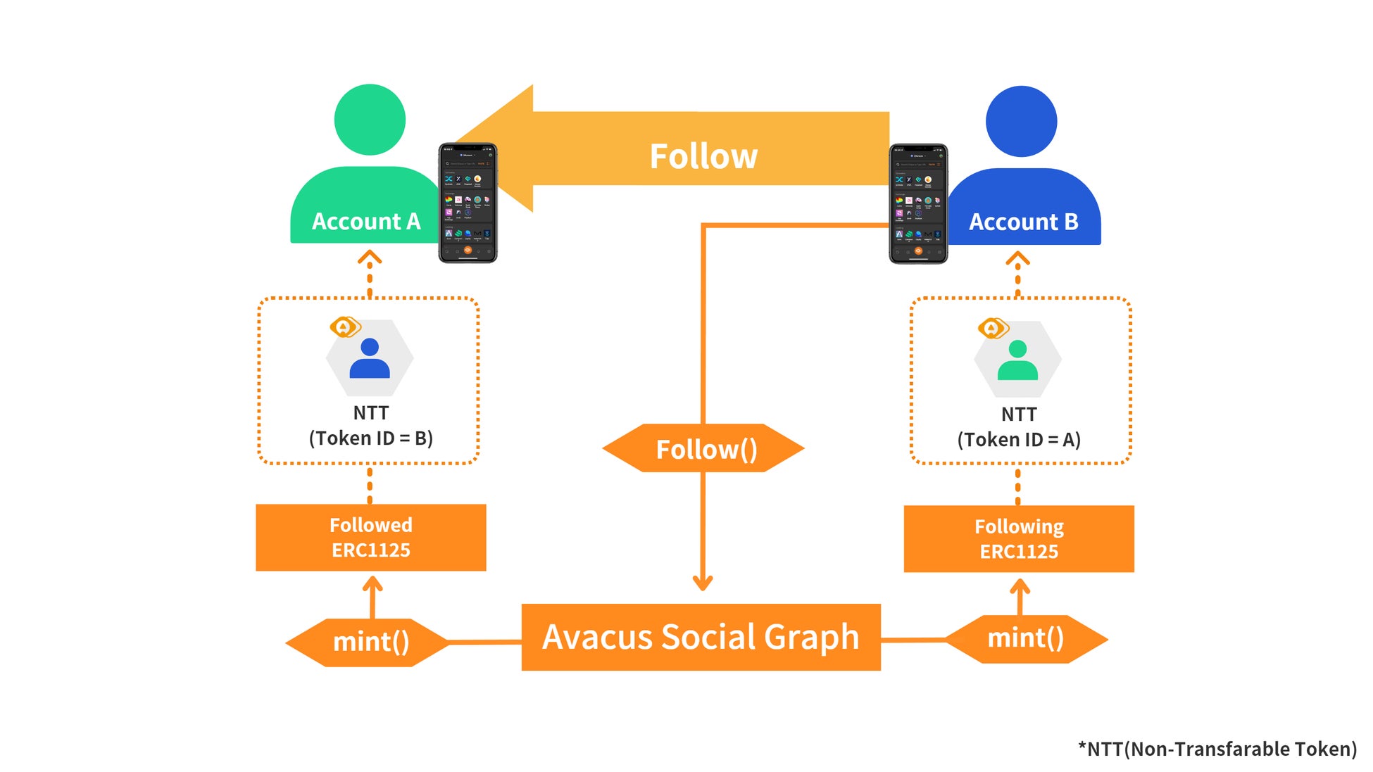 Avacus Social Graphは、ユーザーがあるユーザーをフォローすると双方に「フォローしたことを証明するNFT」と「フォローされたことを証明するNFT」を生成し、それぞれのアカウントに紐づけるものです。
