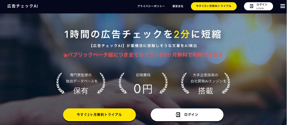 さらに、当社は特別なキャンペーンを実施いたします。スタンダードプランにご契約いただくと、初回2ヶ月間は無料となります。このキャンペーンにより、お客様は新しい広告チェックAIの優れた機能を2ヶ月間無料でご利用いただけます。
