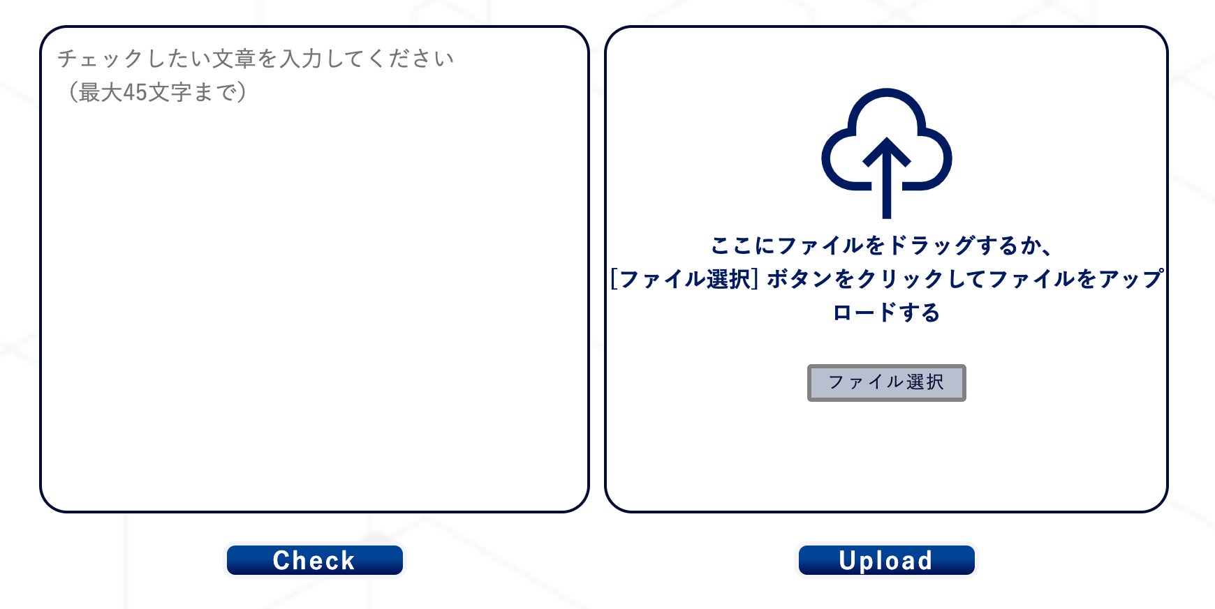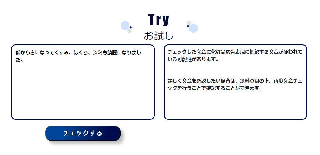 新サービスでは、ワードファイルのアップロードに加え、短い文章(45文字)の入力によるチェック機能も追加されました。これにより、より迅速で簡便な広告チェックが可能となります。