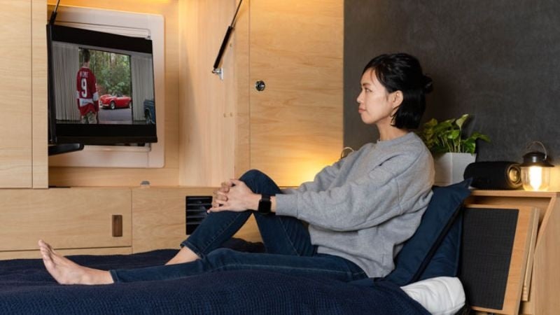 就寝時には折りたたみ式ベッドを取り出しベッドモードに展開が可能です。