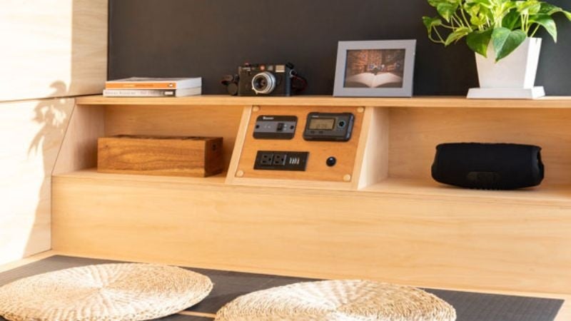 キャンピングカー製造で培った応用力を活かし、家具には木口に綺麗な積層がでるシナ材を使用。
