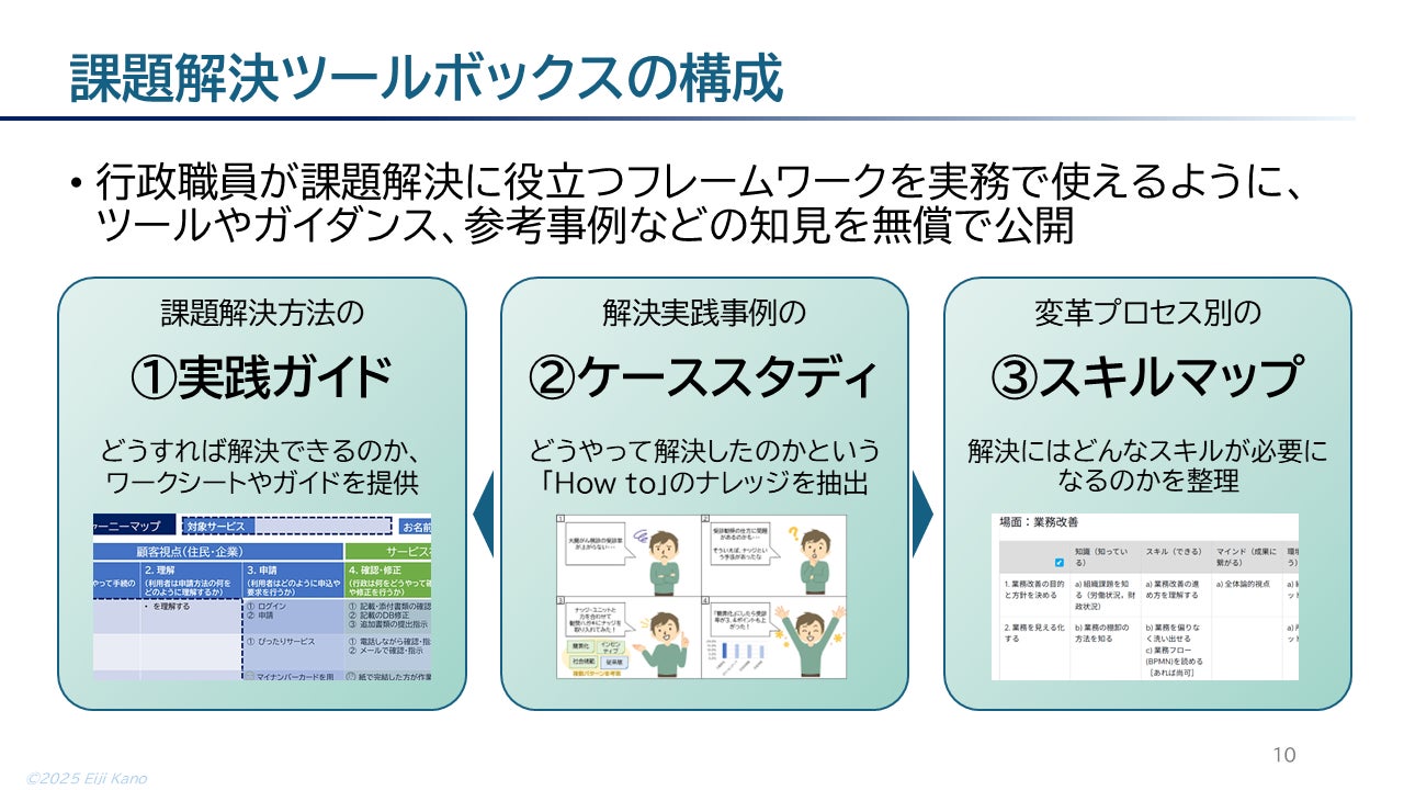 「課題解決ツールボックス」は、公的機関が業務・サービスの変革などの課題解決に取り組むために役立つ、