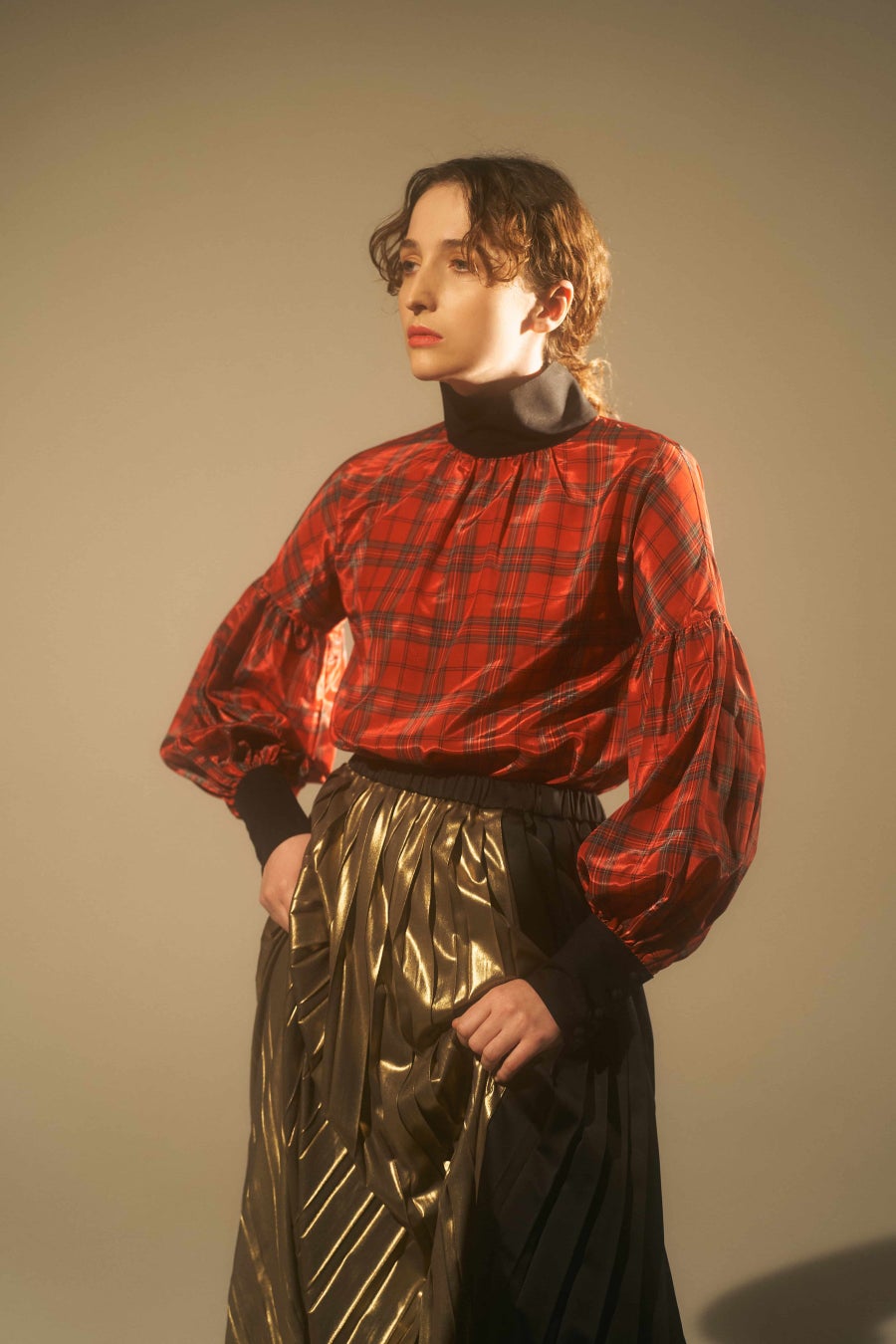 ※左から、カシュクールアシンメトリーワンピース 92,400円(税込)/スタンドパフスリーブブラウス 53,350円(税込)、プリーツスカート 36,025円(税込)