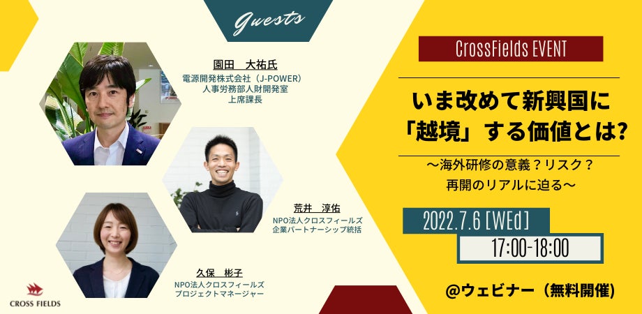 第二回目では「いま海外に越境する価値とは?」をテーマに、新興国派遣型のリーダー育成について改めて考えます。当日は本リリースでもコメントをお寄せいただいたJ-POWER人事労務部人財開発室の園田氏にご登壇いただき、ポストコロナ時代の海外派遣の価値や再開に至った背景と想い、そしてリスク面など再開に向けたリアルに迫ります。参加費は無料ですので、ご関心がある方は以下ページよりぜひお申し込みください。