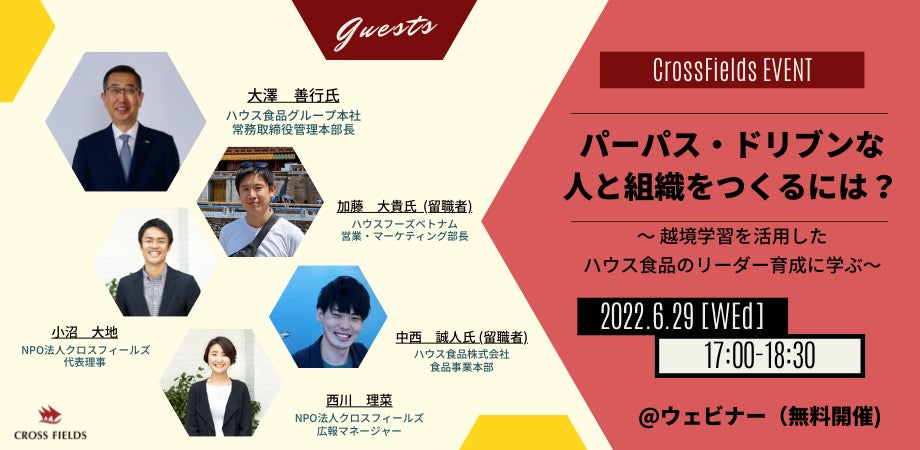 第一回目は「パーパス・ドリブンな人と組織をつくるには?」をテーマに、留職への派遣を8年以上に渡り継続しているハウス食品株式会社の越境学習を生かしたリーダー育成に迫ります。同社 常務取締役管理本部長の大澤善行氏にリーダー育成の考え方をお話頂くとともに、留職プログラム経験者2名を迎え、留職の体験談とその後について深掘ります。