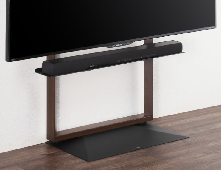 これまで培ったノウハウをもとに、三角形の三辺の和、左右の支柱の間隔、そしてテレビの重心位置をミリ単位で調整し、空間にカモフラージュする抜け感がありながらも高い安定性を実現しました。