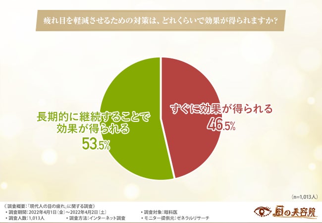 そこで、「疲れ目を軽減させるための対策は、どれくらいで効果が得られますか?」と質問したところ、『すぐに効果が得られる(46.5%)』『長期的に継続することで効果が得られる(53.5%)』という結果になりました。