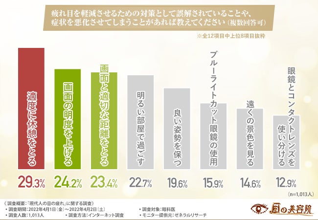 そこで、「疲れ目を軽減させるための対策として誤解されていることや、症状を悪化させてしまうことがあれば教えてください(複数回答可)」と質問したところ、『適度に休憩をとる(29.3%)』と回答した方が最も多く、次いで『画面の明度を上げる(24.2%)』『画面と適切な距離をとる(23.4%)』と続きました。
