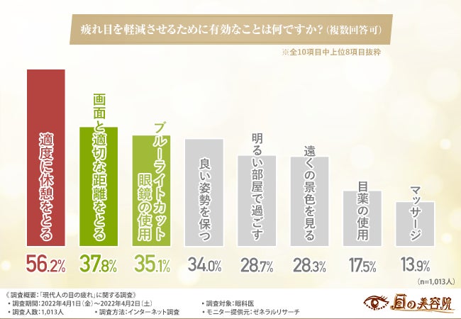 そこで、「疲れ目を軽減させるために有効なことは何ですか?(複数回答可)」と質問したところ、『適度に休憩をとる(56.2%)』と回答した方が最も多く、次いで『画面と適切な距離をとる(37.8%)』『ブルーライトカット眼鏡の使用(35.1%)』と続きました。