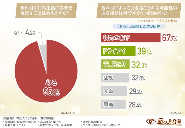 「疲れ目が日常生活に影響を及ぼすことはありますか?」と質問したところ、9割以上の方が『ある(95.8%)』と回答しました。