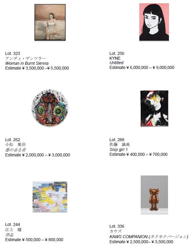 本セールでは、スイスの画家アンディ・デンツラーの「Woman in Burnt Sienna」をはじめ、国内外の注目作家の作品が一堂に会します。デンツラーは抽象表現主義とフォトリアリズムの狭間で多層的に表現される人物画で知られ、その構図はバロック時代の古典絵画が現代に翻訳されたかのような表現的な筆使いで描かれています。また、KYNEの「Untitled」や小松美羽の「悪の去る音」など、日本のコンテンポラリーアートを代表する作家の作品も出品されます。佐藤誠高の「Snip girl 1」や江上越の油彩作品の他、カウズの代表的キャラクターCOMPANIONの流れるような木目が美しい立体作品も登場いたします。