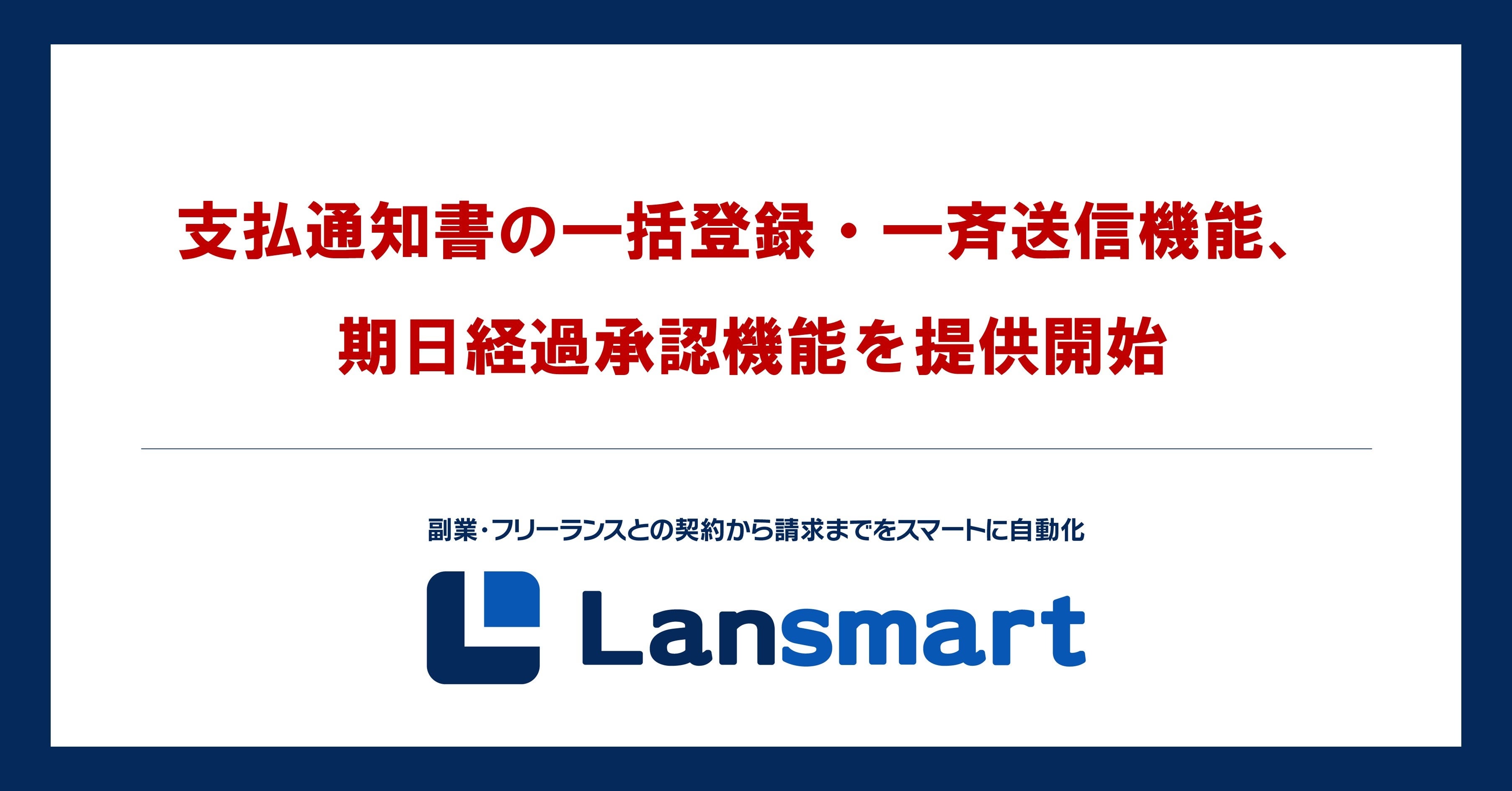 副業・フリーランス管理クラウド「Lansmart(ランスマート)」、支払通知書の一括登録・期日経過承認機能を提供開始