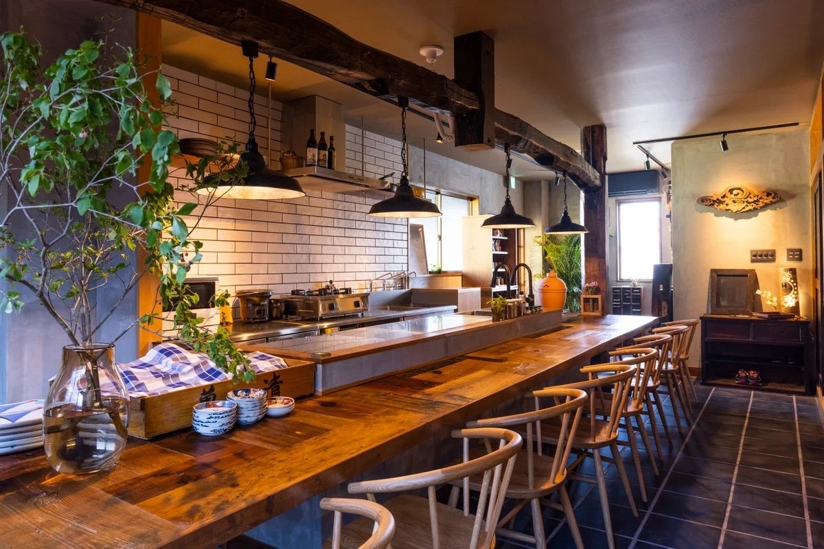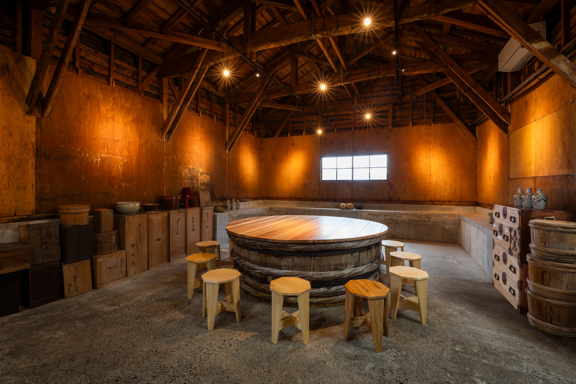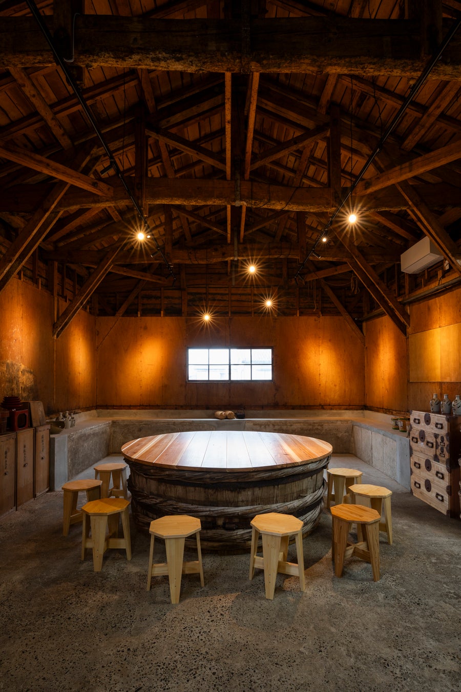 中央に配置したテーブルは、以前味噌を仕込む際に使用していた木桶をリメイクしたもの。職人の手しごとを感じる空間の象徴にもなっています。