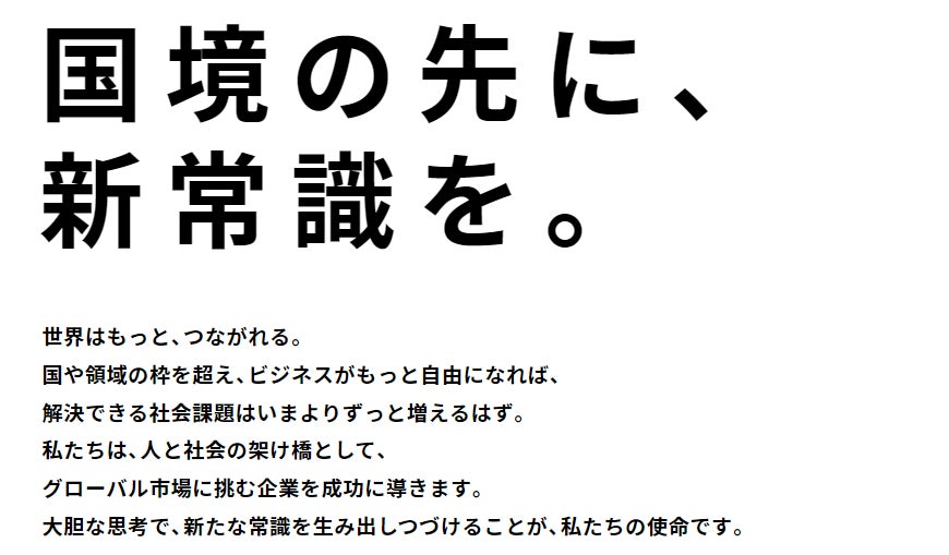 また、このたびの機会を「第2の創業期」として、より積極果敢なグローバルチャレンジを全社員一丸となって取り組んでいくことを明確に掲げるため、当社の存在意義・あるべき姿を表現した「MISSION(ミッション)」を、「国境の先に、新常識を。」に変更いたしました。