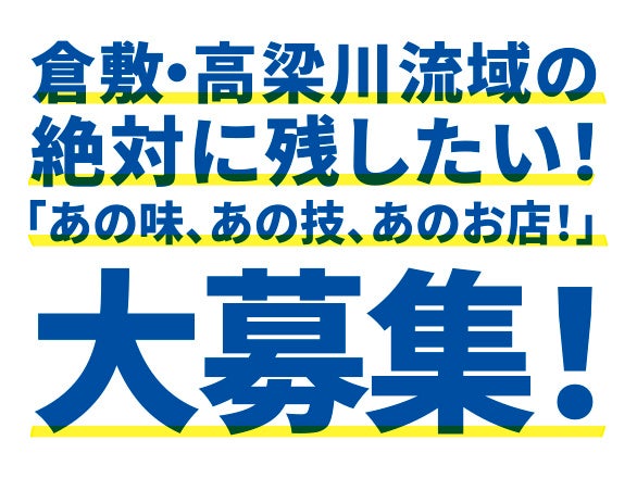 伝統産業や地場産業、地元の名店等の廃業が増加することで、地域ブランド力の低下につながることが懸念されています。そのため、多くの人に長年親しまれてきた地域の飲食店の味、伝統工芸技術などを次の世代に残すことを目的に、ニホン継業バンクでは、倉敷市、株式会社ビザビと協働で、倉敷市を中心とした高梁川流域圏域内の「絶対に残したい!あの味、あの技、あのお店!」として情報を広く募集しました。