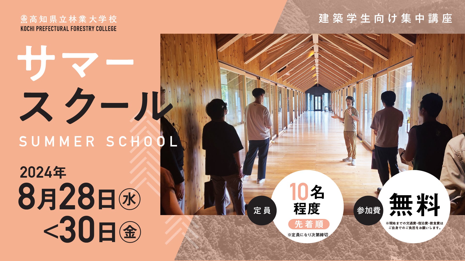 建築家・隈研吾氏が校長を務める高知県立林業大学校(高知県香美市)は、建築を専攻する学生の方々に向けて、高知の森林と木造建築を学ぶ3日間のプログラム:サマースクールを開催します。高知のCLT木造建築の見学や、建築家・隈研吾校長が手がけた梼原町の建築群を隈研吾建築都市設計事務所の担当者が解説しながら見学します。また、梼原町の森林や製材工場の見学など、充実のプログラムです。これからの木造建築を担う皆様のご参加をお待ちしています。