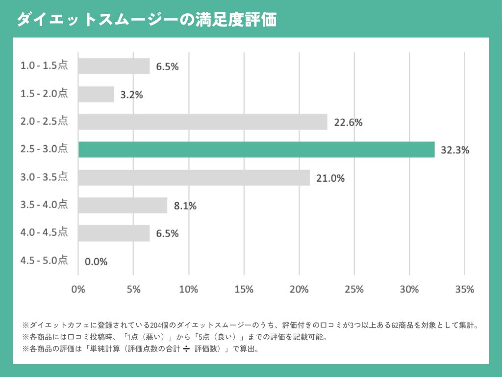 ダイエット効果が期待される62種類のダイエットスムージーに寄せられた2736件の口コミを分析したところ、「2.5-3.0点(少し悪い)」という評価を受けている商品が32.3%(20商品)と最も多くなっていることが判明しました。