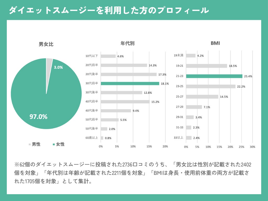 ダイエット効果を期待してスムージーを利用する方々のプロフィールについて、62種類のダイエットスムージーに寄せられた2736件の口コミを分析しました。その結果、利用者の97.0%が女性であり、年齢層は30代前半が特に多くなっていました。さらに、肥満度指数(BMI)に関しては、健康的な標準体重(22)付近である「21-23」の範囲の方が25.4%と最も多いことが分かりました。