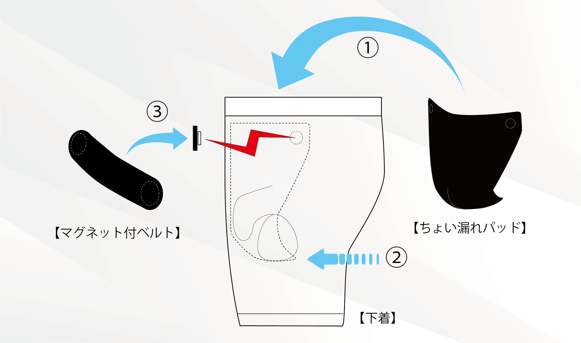 ③ マグネット付ベルトの磁石と本体の磁石で下着を挟んでください。