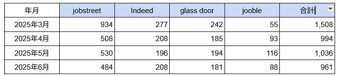 主要4サイト別の掲載数としては、「jobstreet」が484件、「Indeed」が208件、「glass door」が181件、「jooble」が88件となり、複数の求人サイトで900件の推移を保つ求人募集が行われています。