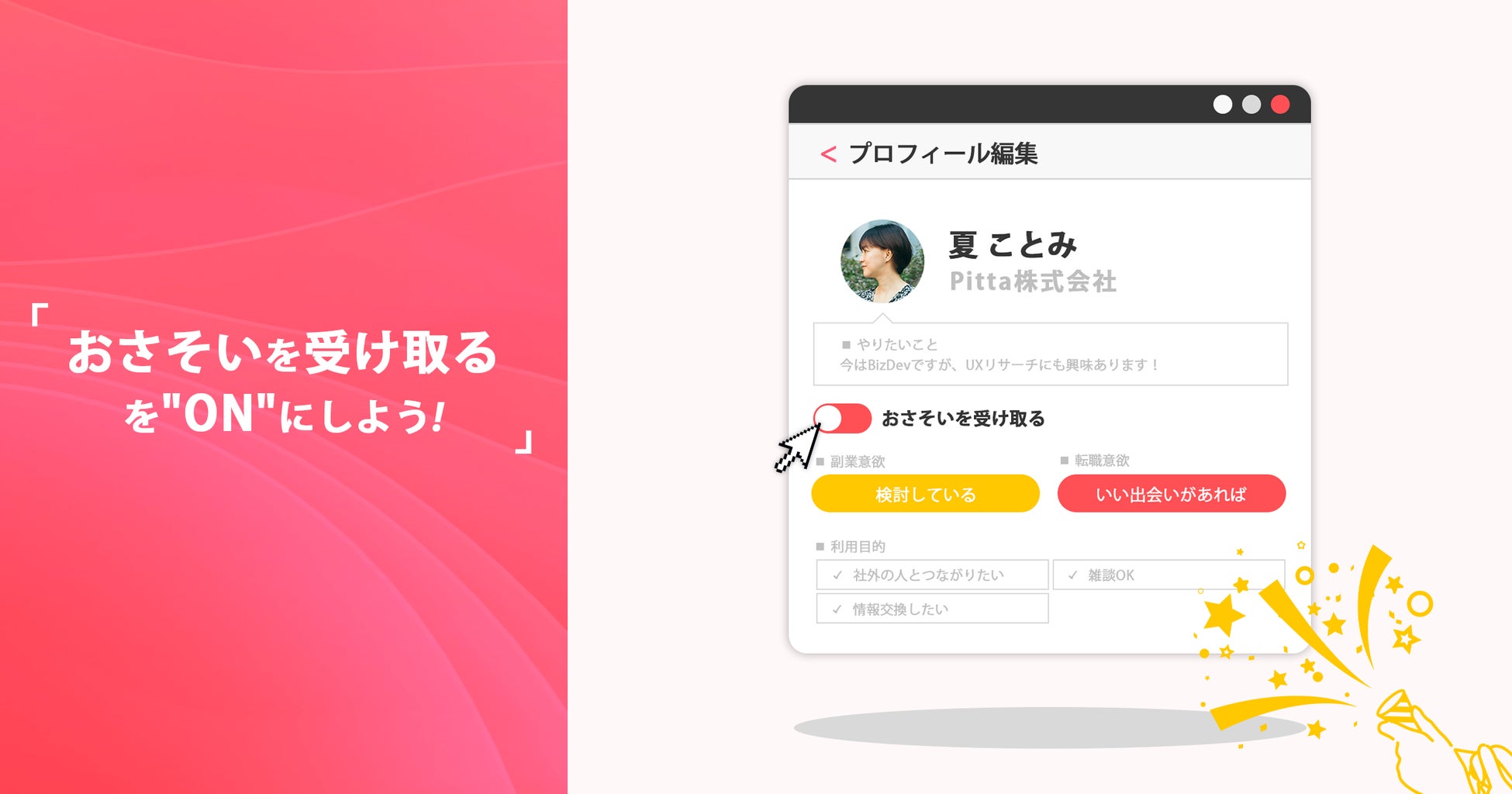 2023年11月7日(火)からおさそい機能が始まります。おさそいを受信したい方は、それまでに受け取り設定、転職・副業意欲の変更を行なってください。受け取り設定は、プロフィール編集ページ( https://pitta.me/m/profile )から行えます。