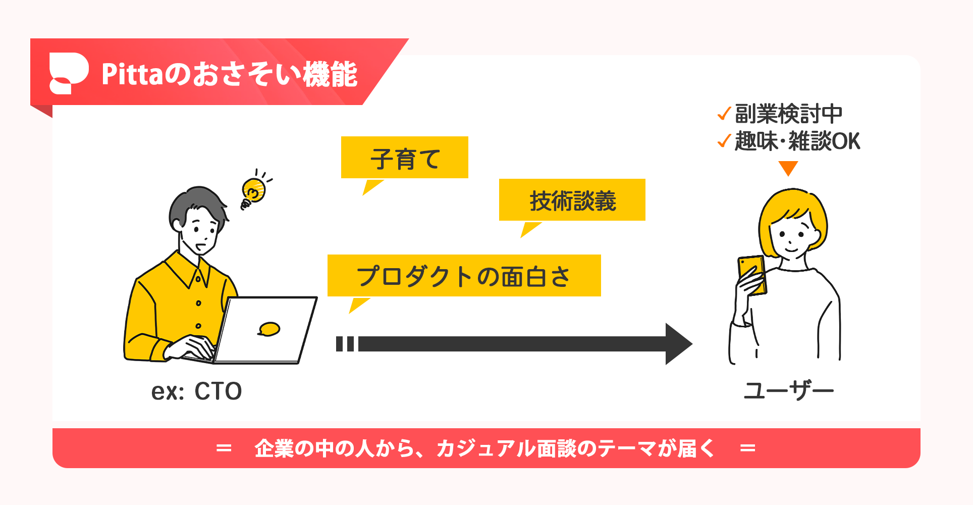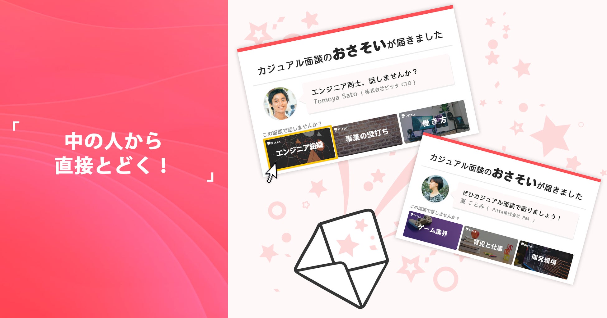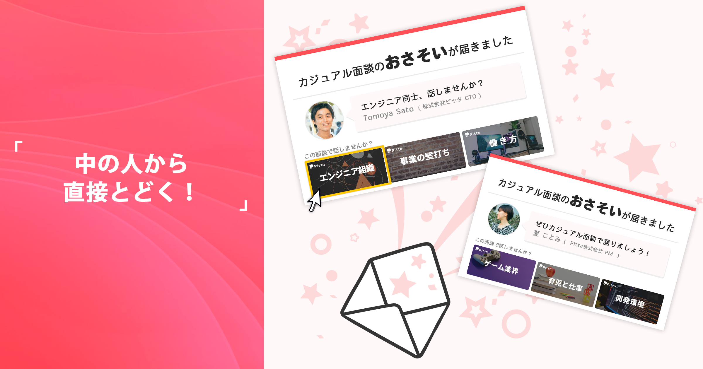 Pittaのおさそい機能は、企業の中の人(人事以外も含む)から「仕事の面白さ」「働く環境」「チームの雰囲気」「個人的な経験談」などをテーマにしたカジュアル面談のおさそいが届く体験になっています。
