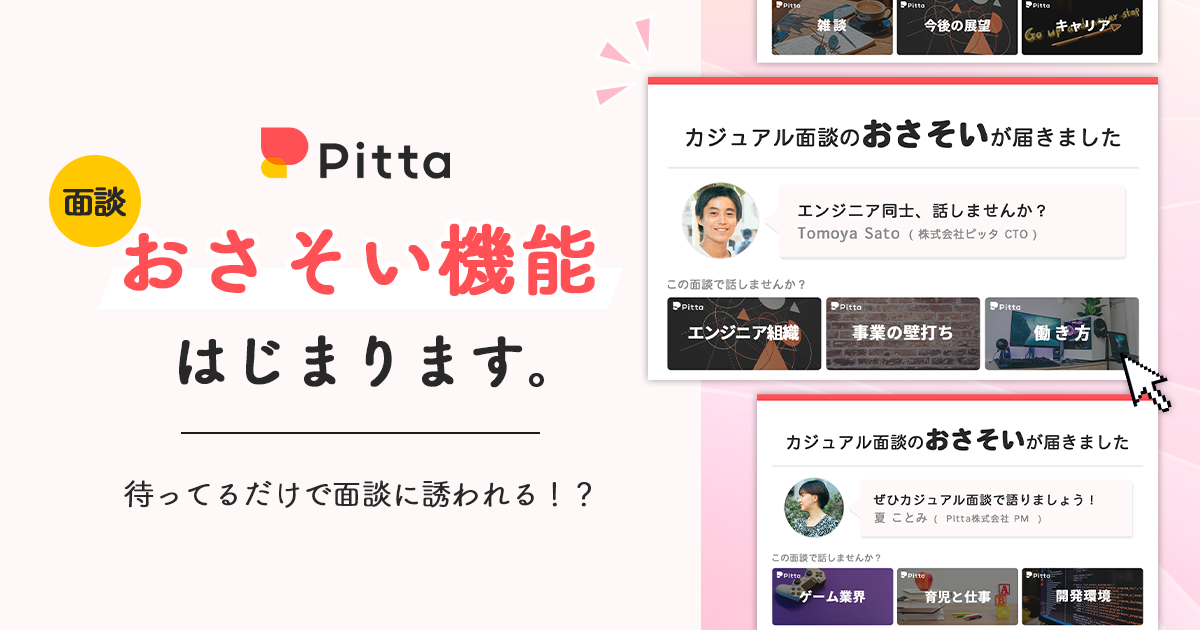 カジュアル面談のPitta、新サービス「おさそい機能」を提供開始。おさそい受け取り "ON" で待てば、カジュアル面談がむこうからやってくる!