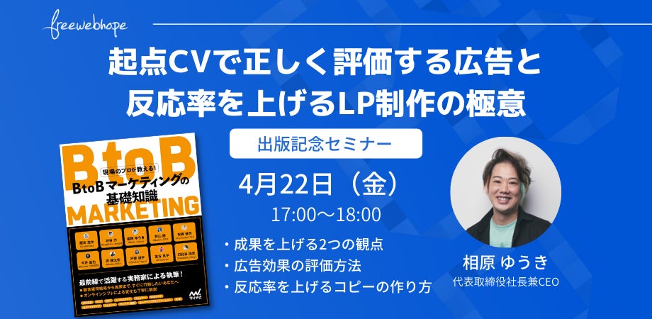 株式会社free web hope(本社:東京都千代田区、代表取締役:相原祐樹)は、無料のオンラインセミナー「起点CVで正しく評価するBtoB広告と反応率を上げるBtoBLP制作の極意」を4月22日(金)に開催いたします。(申し込み先:https://bit.ly/36iVKb2)