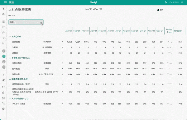 パナリットの人財諸表は独自定義の6項目・95種類からなる各種HR指標を用い組織をリアルタイムかつ定量的に理解することができます。
