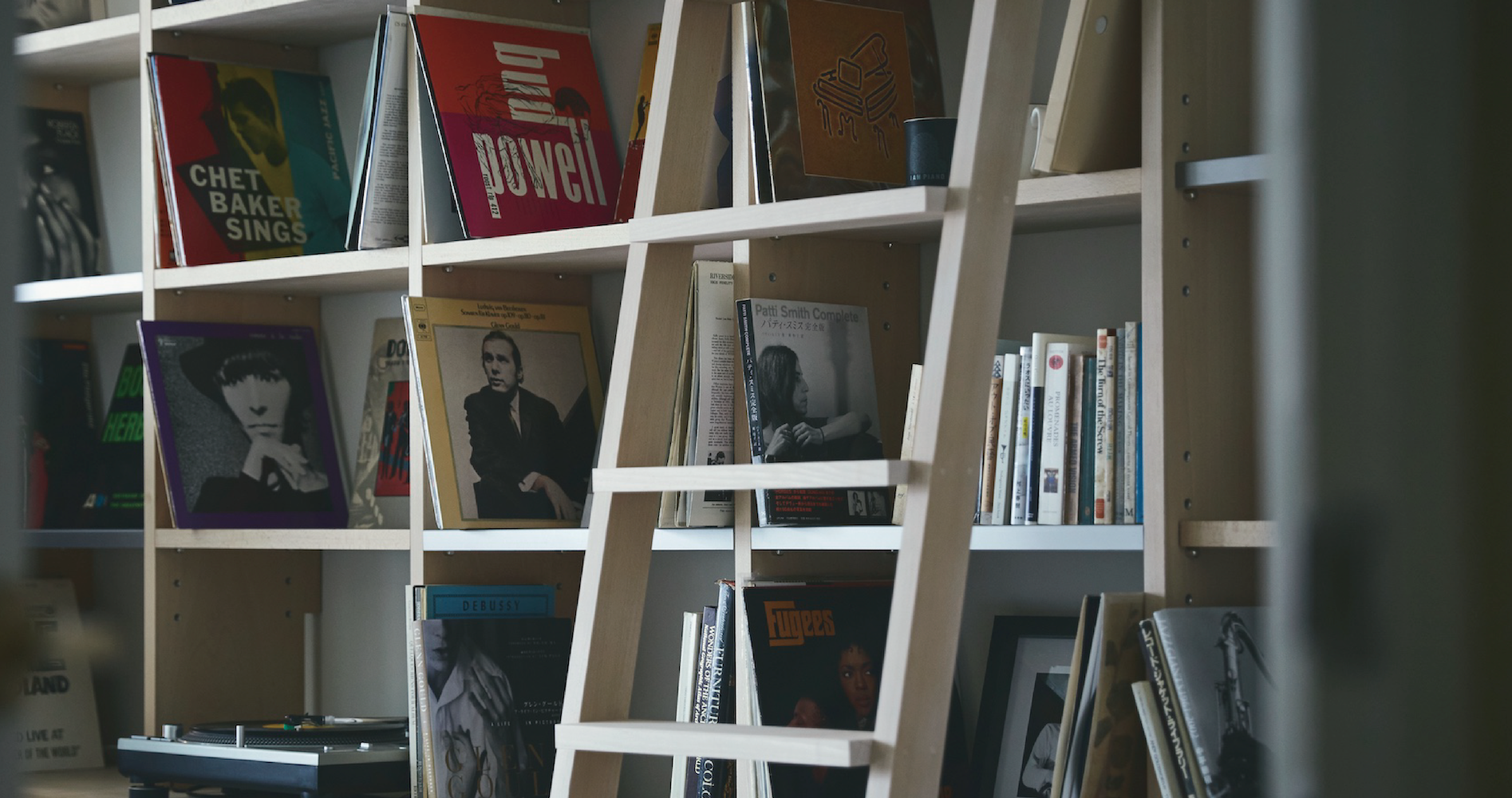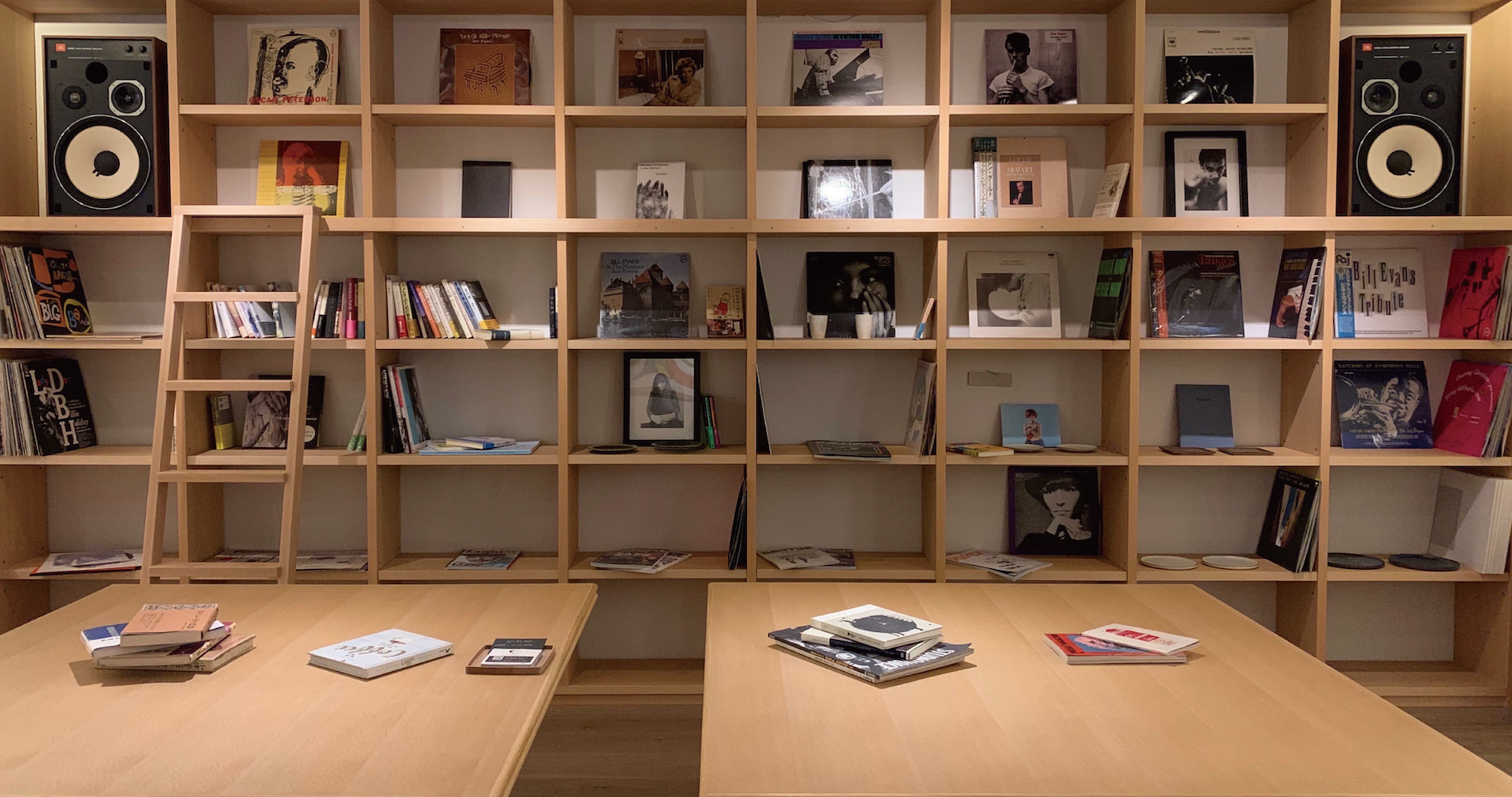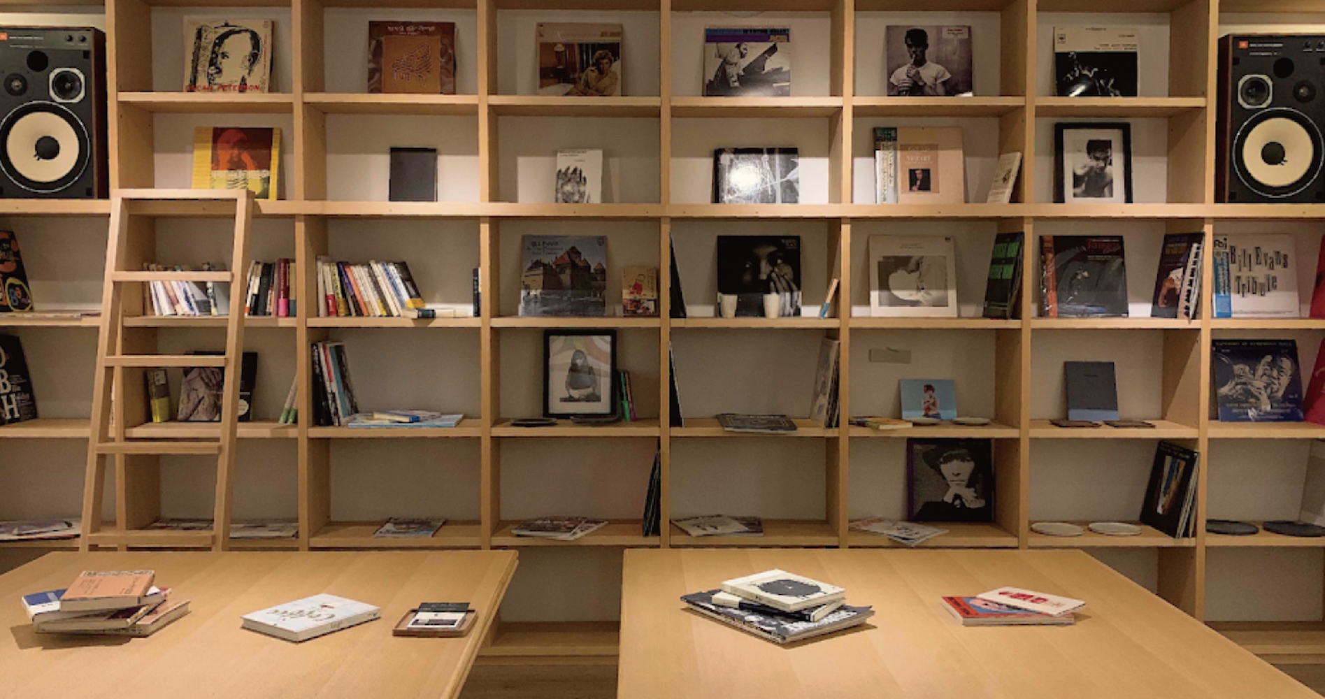 カフェスペースには、象徴的な大きな本棚が。テーマに沿ってセレクトされた貴重な古本やレコードが並ぶ。