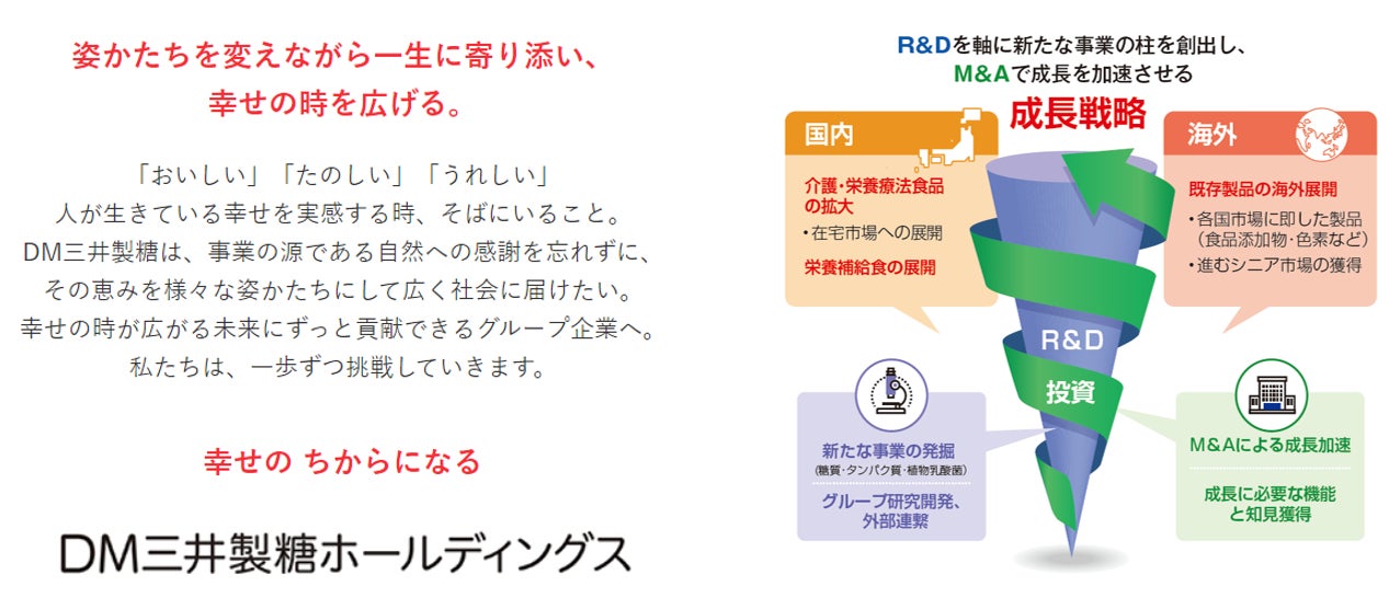DM三井製糖グループは、世代を越えた様々な人と社会の“幸せの ちからになる“ために必要とされる栄養と健康のソリューションをお届けする企業グループを目指しております。また、“中期経営計画-2026 Diversify into Nutrition & Health”では、①国内砂糖事業の強靭化、②海外事業の拡大、③ライフ・エナジー事業の成長、④グループの持つ研究開発力の集積・強化、⑤持続可能な社会実現への貢献を推進します。今回の譲り受けは5つの重要テーマのうち、③ライフ・エナジー事業の成長に大きく貢献するものと考えており、引き続き他のテーマの推進にも併せて取り組んでまいります。