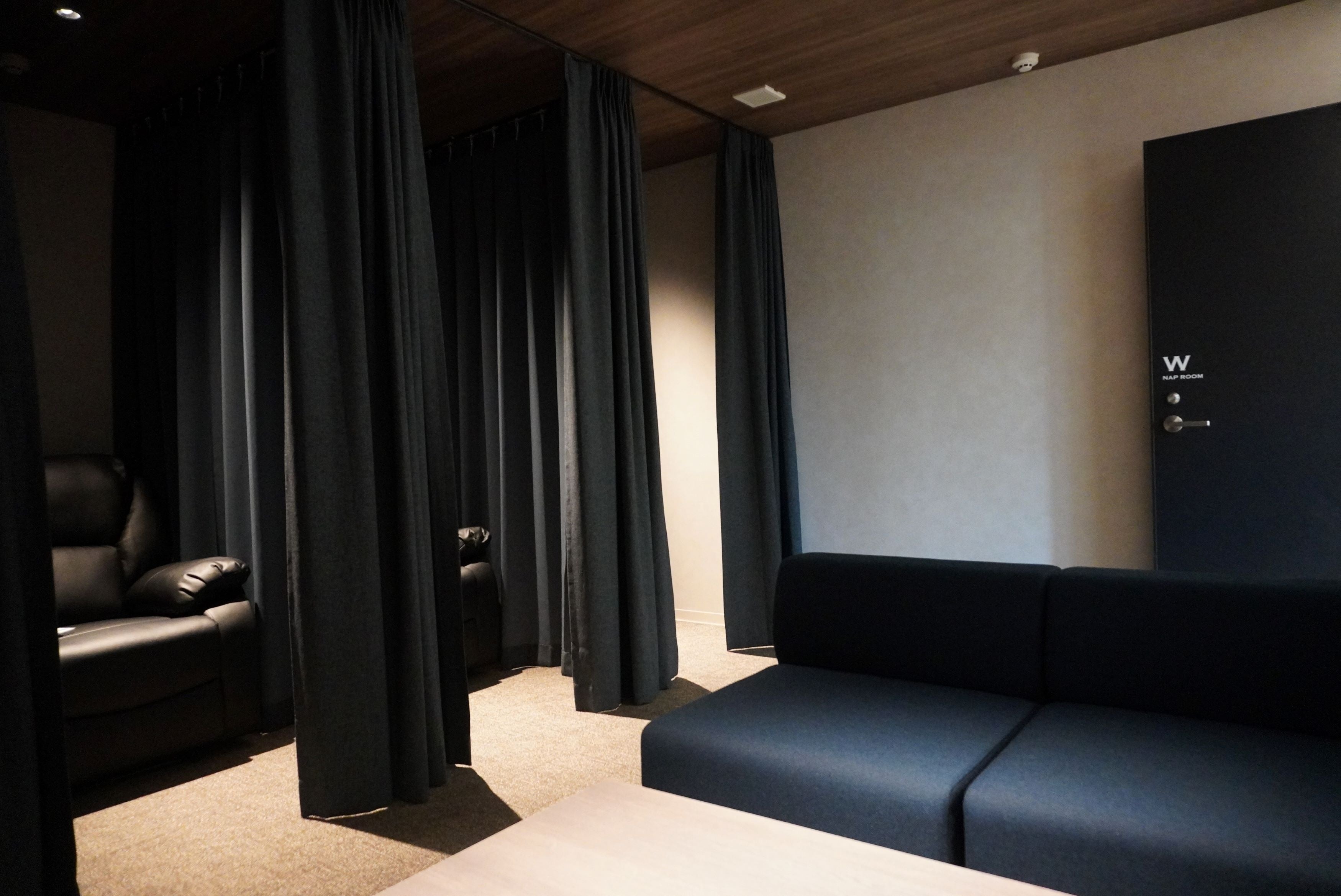 写真右上)男女に分かれた仮眠室。ほどよい暗さで入眠しやすく