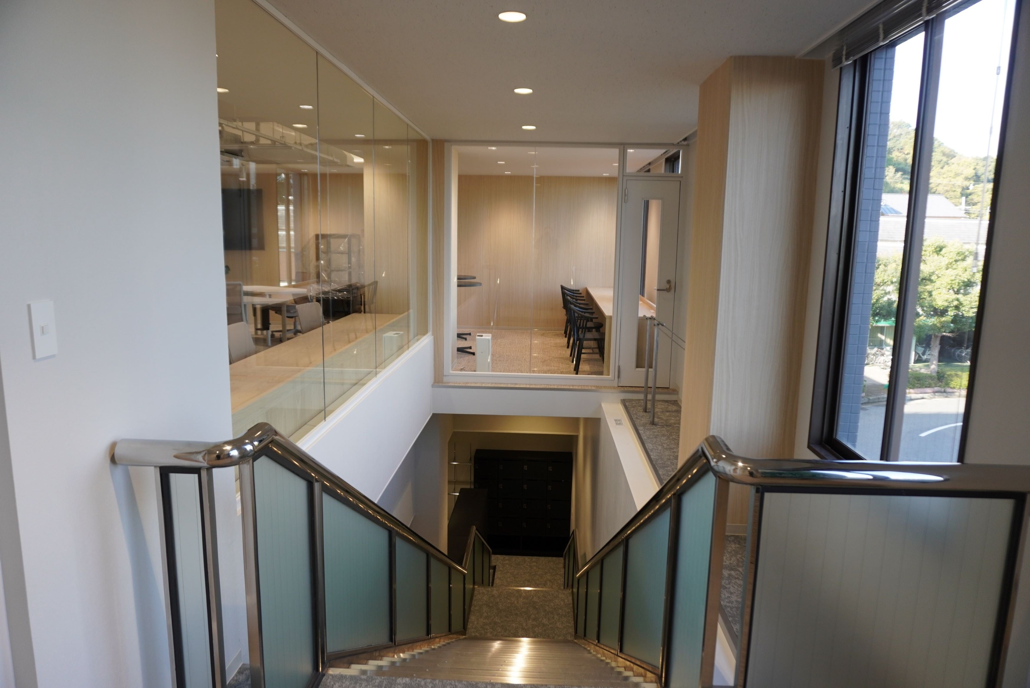 写真左)階段を上がって2階コールセンターへ。採光を考えられた設計