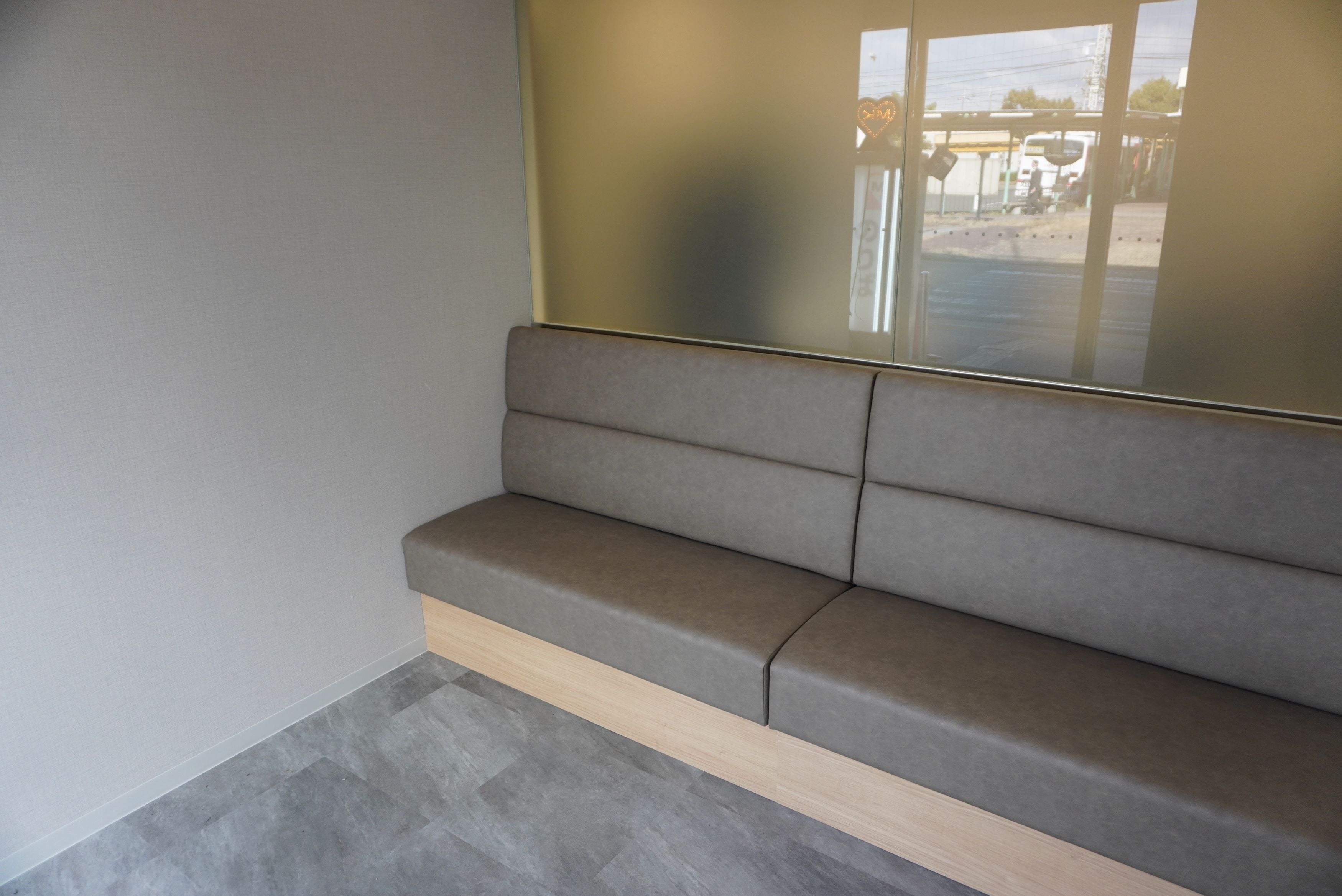 1階は営業所としてドライバーの動線を考え出入りをしやすくし、複数のミーティング室、旧営業所は手狭で開催できなかった全員業務集会を営業所内で出来るスペース、MK八幡のりばご利用のお客様が待機できる待合室を備えています。ロータリーに向かって大型ディスプレイを設置し情報を流します。男女に分けた仮眠室は一人用リラクゼーションソファをカーテンで間仕切りしており周囲の目を気にせず仮眠をとれ仕事とのメリハリをつけます。