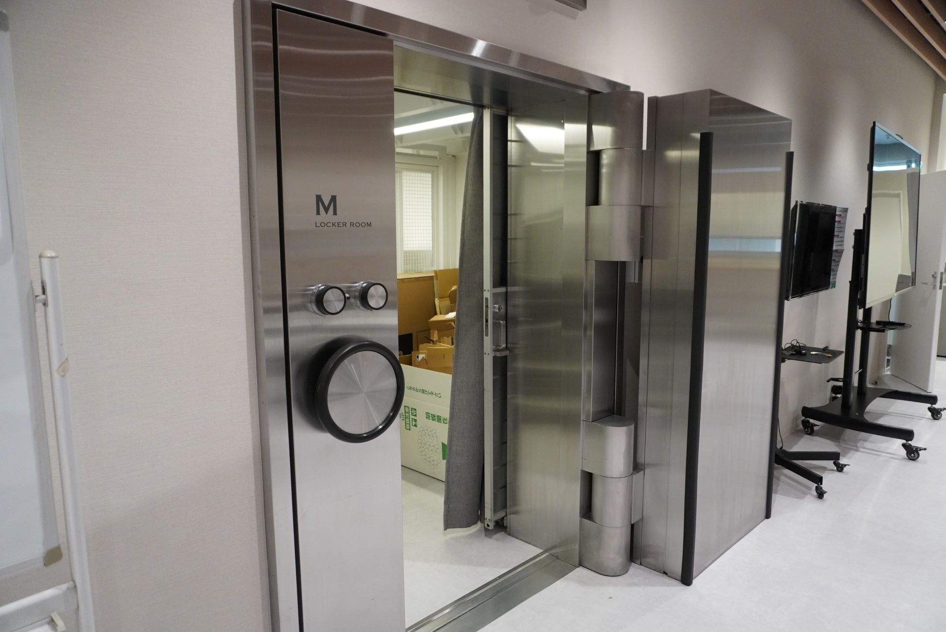 写真左上)銀行だった名残の大金庫。中はロッカールーム・倉庫として利用