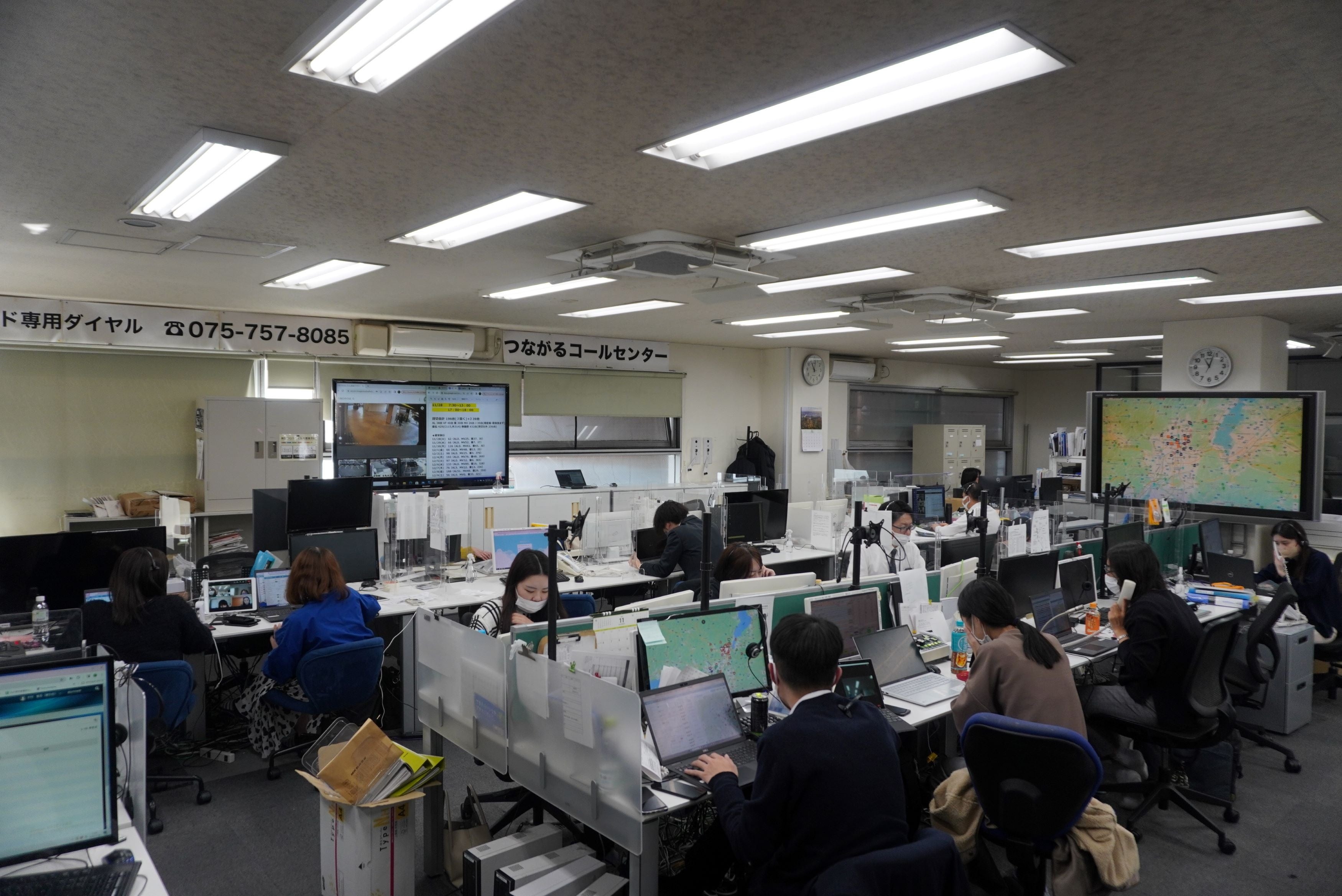 コールセンターは働き方改革の一環でコロナ禍前よりクラウド型タクシー配車システムを提供する株式会社電脳交通と協同で、オペレーターが自宅で受注できる「リモート受注」の仕組みを構築し2019年から札幌のオペレーターからテスト導入、2022年5月に最も配車件数の多い京都で本格導入しました。いまでは多くのオペレーターはリモート受注で業務しています。コールセンターに出社して執務するのは主にドライバーへの配車指示等を行う管理業務担当やリモート受注オペレーターが対応できない質問や注文電話の転送を受けるサポート係などで、出社人数はコロナ前と比べると半減して現在は約20名に留まります。