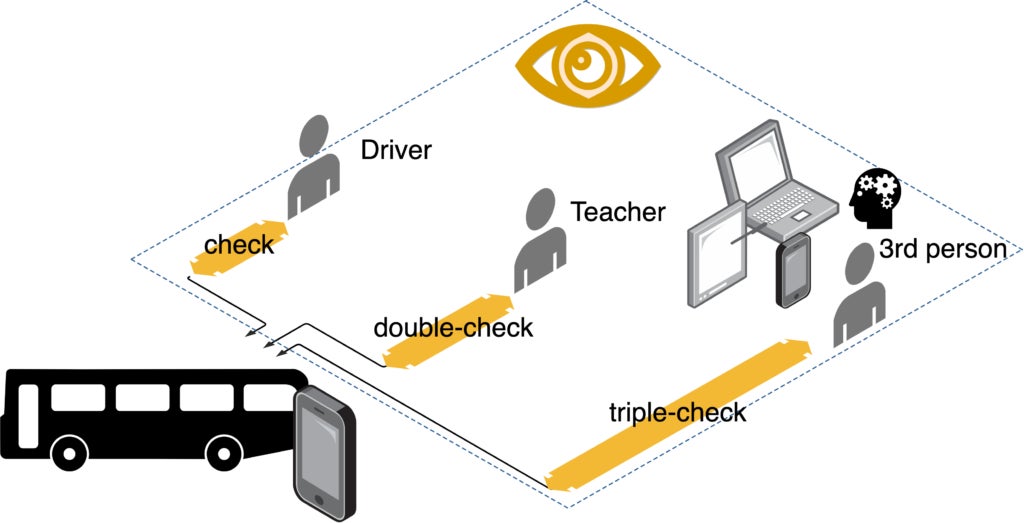 運転手がブザーを停止するにはバスの後方に移動する必要があり、車内にいる子どもの見落としを自然と防げる仕組みです。