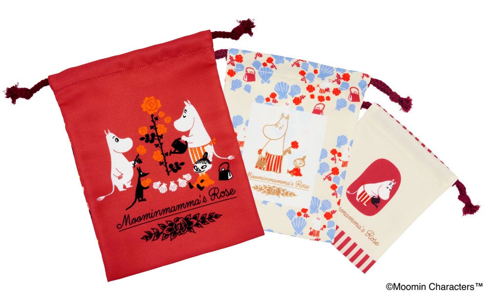 デザインと大きさが異なる巾着セット。使い勝手のよいサイズで、ムーミンママがいつも持っているハンドバッグのように、いざという時役に立つものをそれぞれに入れておきたくなります。