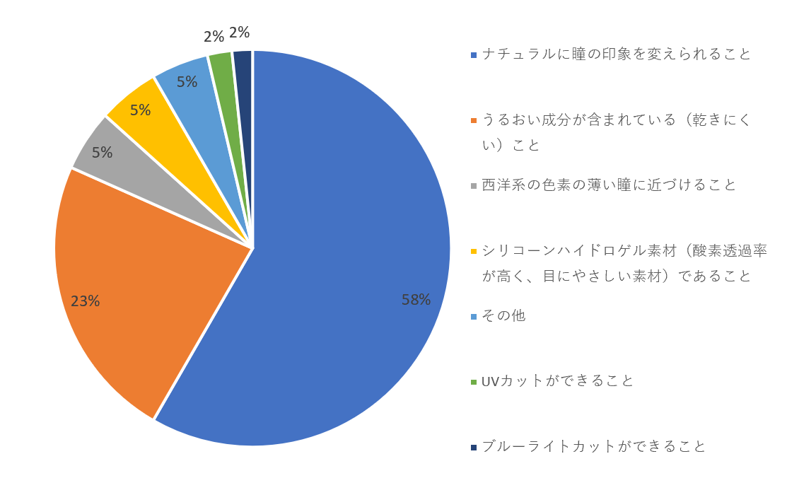 最も重視するスペックでは「ナチュラルに瞳の印象を変えられること」が全体の58%を占めました。これは人気ブランドランキングで1位の「TOPARDS」でナチュラルさが数多く評価されていたことからも、納得の結果と言えるでしょう。