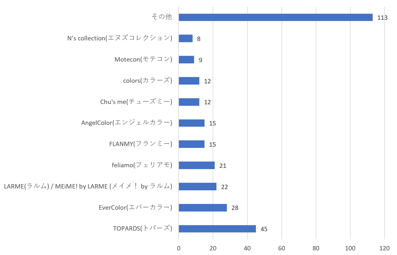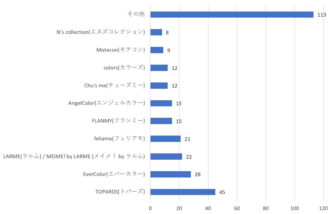 前回同様「その他」の比率も非常に大きくなっています。その他の内訳は、ジョンソン・エンド・ジョンソン株式会社の「ワンデー アキュビュー® ディファイン® モイスト®」(回答数19)、次いで株式会社シードの「Eye coffret(アイコフレ)」(回答数11)など、大手企業の製品が根強い人気でした。