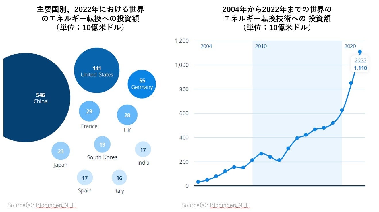 また、再生可能エネルギー技術は競争力を増し、エネルギー転換への投資総額は、2022年には1兆1,000億米ドルとなり、1年前の8,490億米ドルから増加しました。再生可能エネルギーへの投資は、今後も伸び続けると予測されています。