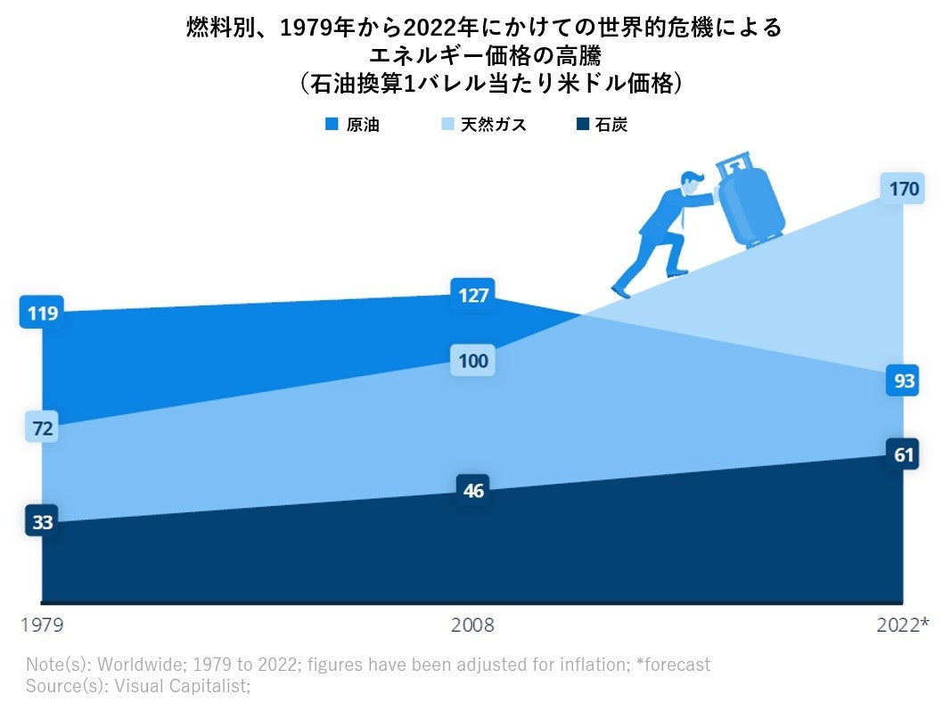 世界はこれまで何度かエネルギー危機を経験してきましたが、以前の危機は、主に原油に影響する単独したものとも言えます。インフレを加味すると、1979年と2008年のショック時の原油価格は、それぞれ原油換算すると1バレルあたり約119米ドルと127米ドルでした。これに対し、2022年の原油価格は1バレル当たり平均93米ドルになるとされています。しかし、天然ガスと石炭の価格は、それぞれ原油換算で1バレルあたり170米ドルと61米ドルと推定され、過去最高を記録し、エネルギー価格が世界中で上昇しています。