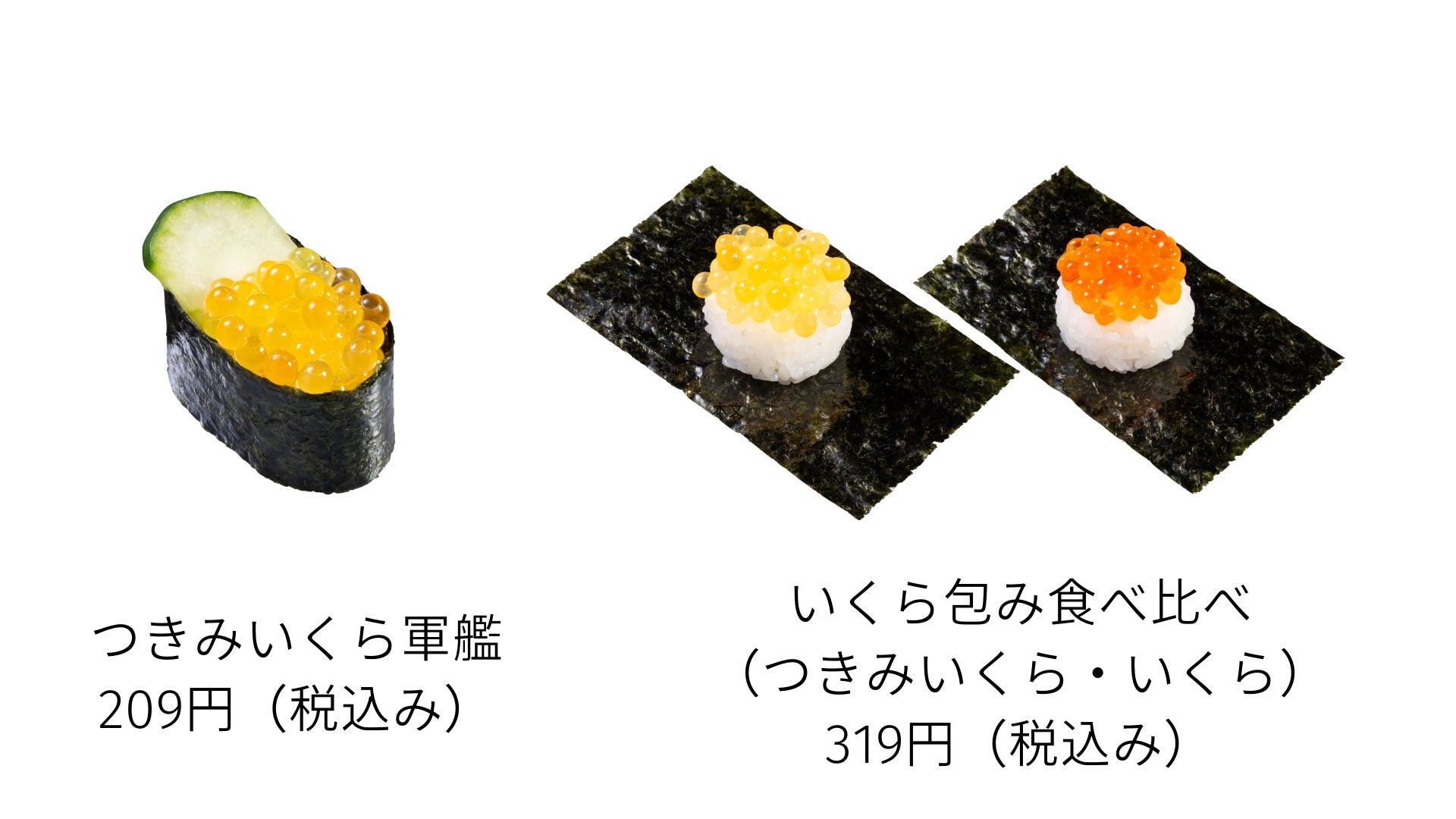 「いくら包み食べ比べ(つきみいくら・いくら)」:二貫 319円(税込)