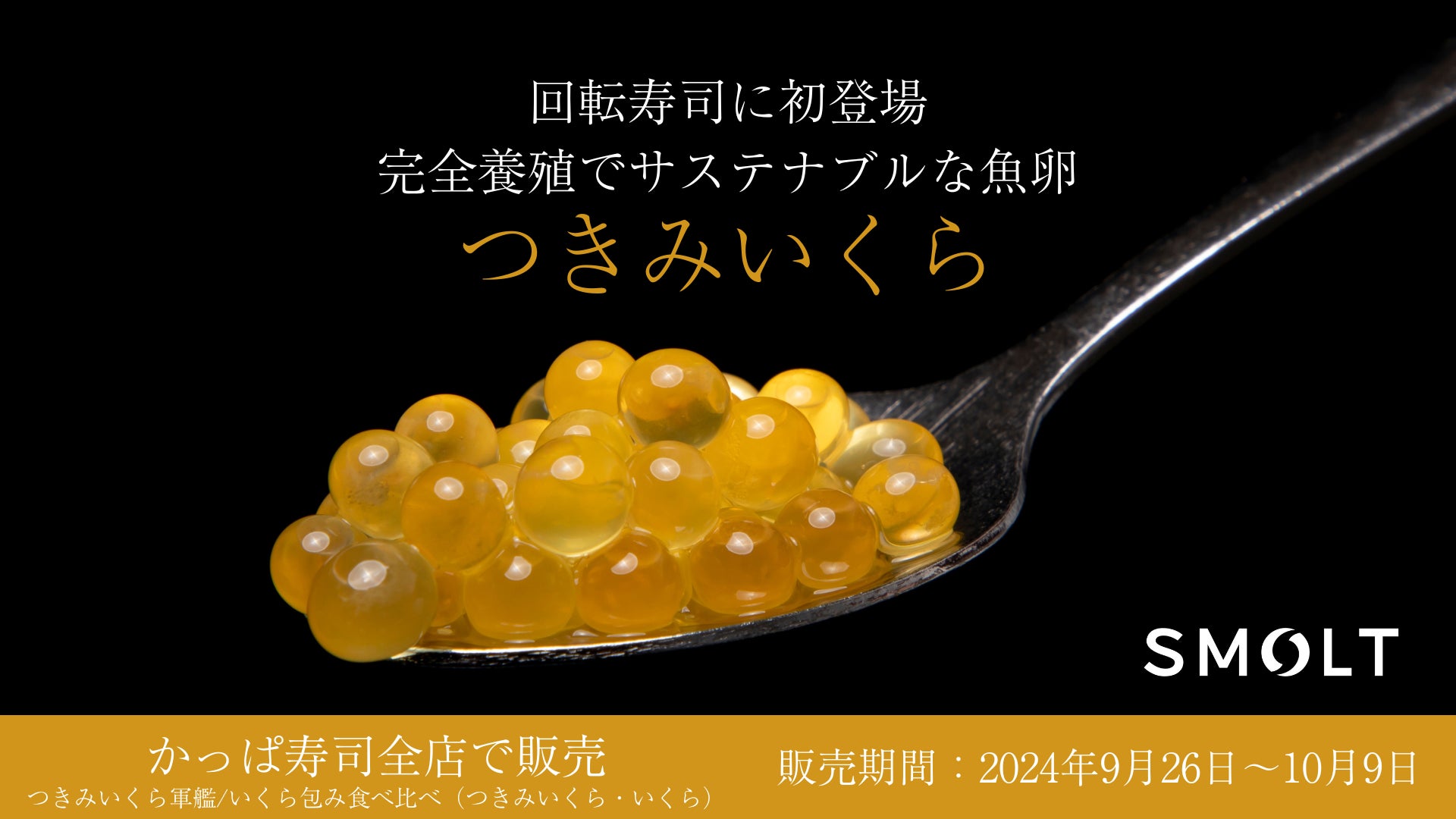 株式会社Smolt(本社:宮崎県宮崎市、代表取締役:上野賢)は当社が開発・生産する「つきみいくら🄬」を、カッパ・クリエイト株式会社(本社:神奈川県横浜市、代表取締役社長:山角豪)が運営するかっぱ寿司全店にて2024年9月26日(木)から10月9日(水)までの期間限定で販売することをお知らせいたします。
