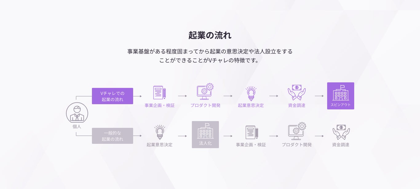 参加者はデライト・ベンチャーズの支援を受けながら約5ヶ月で事業アイデアの検証を実施し、その後、プロダクト開発や運営を経て株式の82%を得ての独立起業を目指すことができます(※1)。Vチャレを通して、優秀なビジネスパーソンが起業にチャレンジする機会創出を推進してまいります。