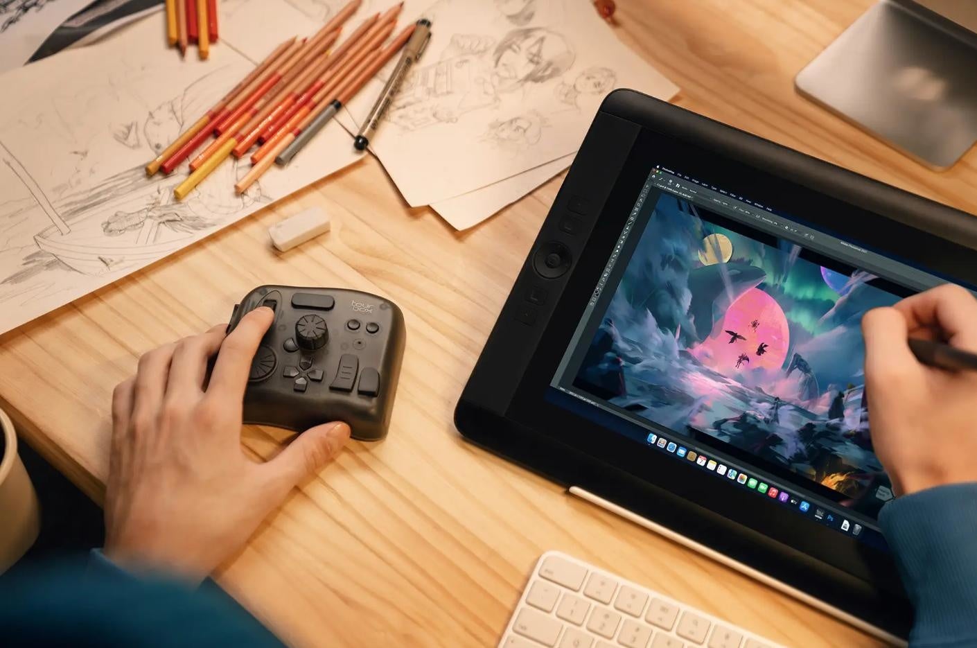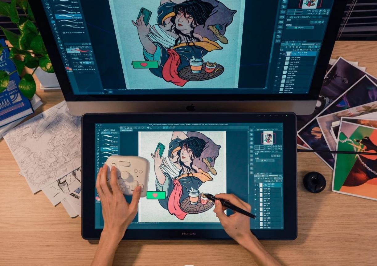 「Clip Studio Paint」「SAI」などのペイントソフトでイラストを制作する時、キャンバス回転やブラシサイズ、角度の調整ダイヤルやスクロールで便利に完成できます。ボタンを回すだけで好きな角度やサイズを思うままに選択でき、絵描きの操作も中断することなくシームレスに進行できます。