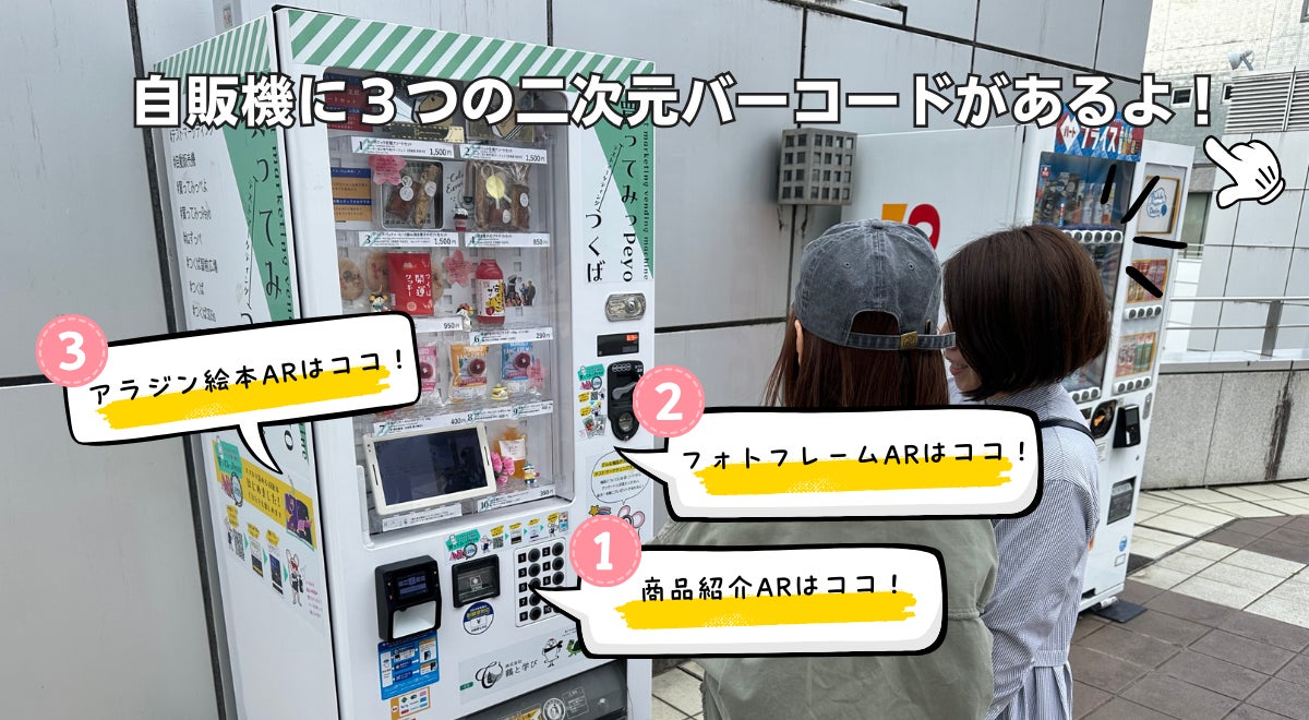 1.自販機にある3つのQRコードをチェック!(商品紹介AR・フォトフレームAR・アラジン絵本AR)